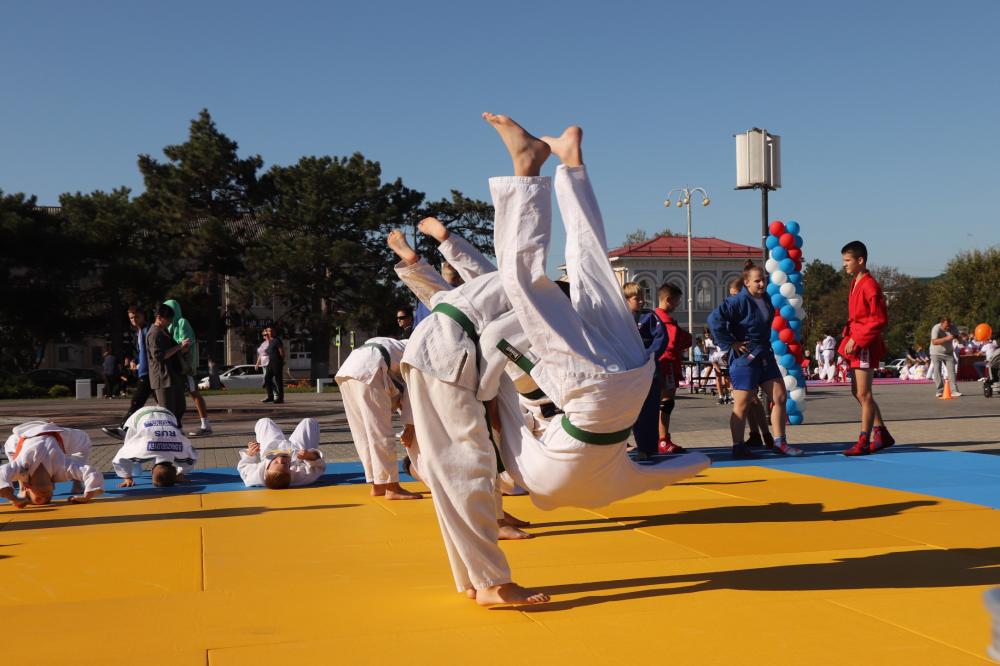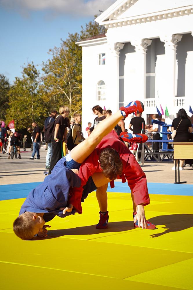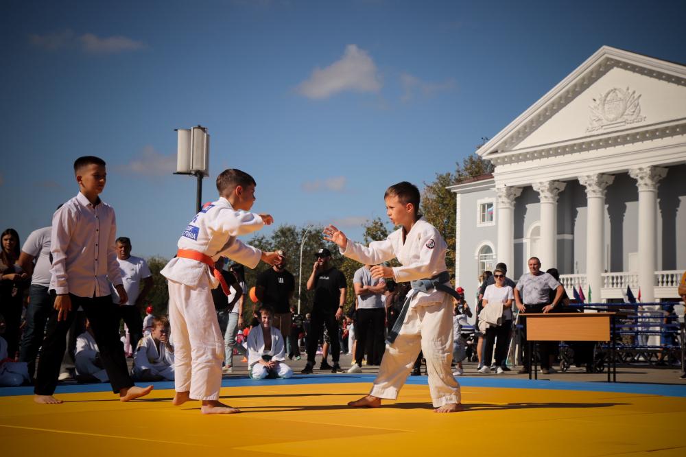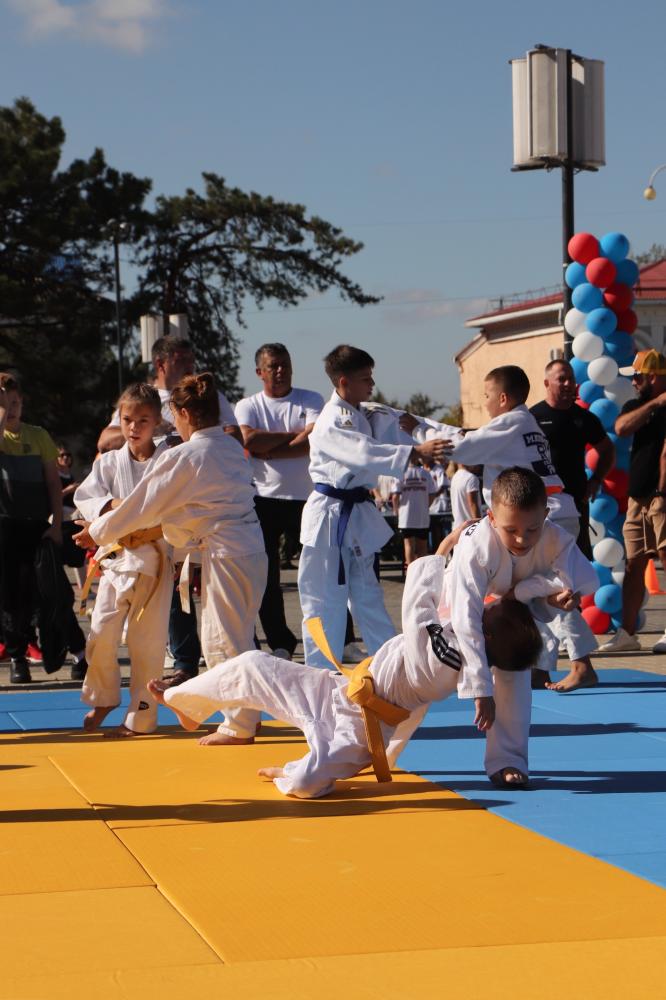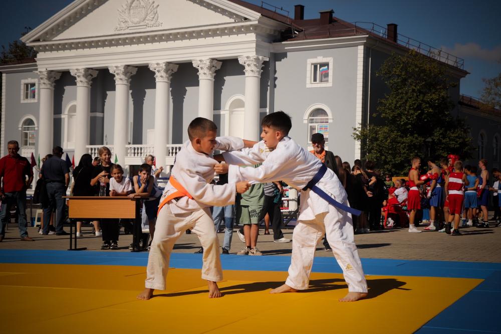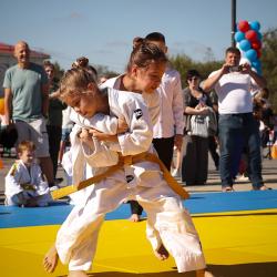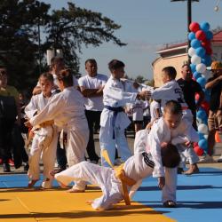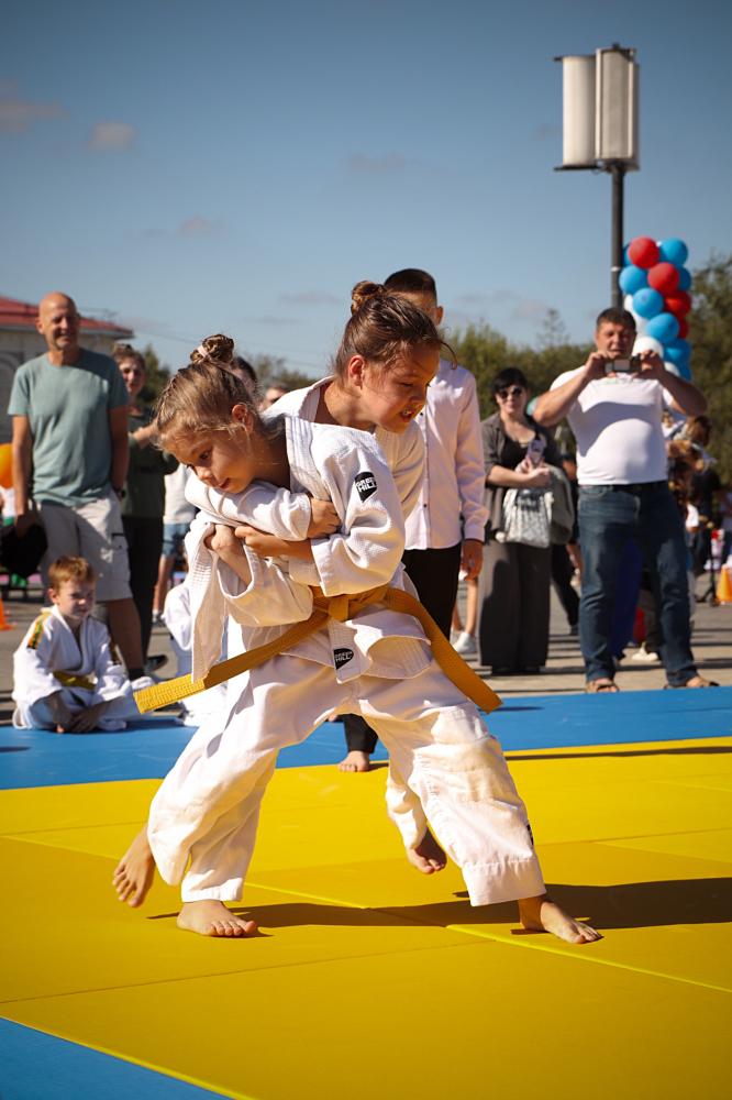 Дзюдоисты и самбисты спортшколы "Виктория" показали детворе и взрослым красивые приемы и броски, а также элементы базовой техники дзюдо в рамках фестиваля для подростков и молодежи "Район спортивных достижений", который прошёл 5 октября на площади Труда.