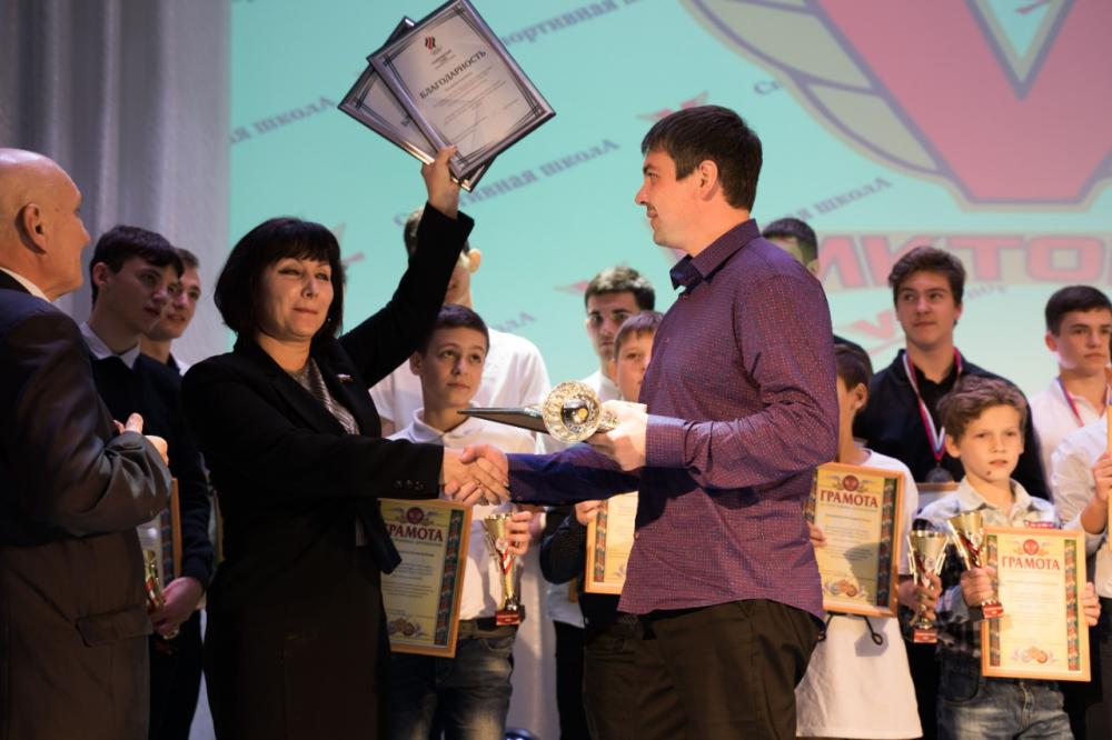 Награждение спортсменов Спортивная школа «Виктория» 19 декабря 2019 г. В РДК г. Темрюк прошла церемония награждения спортсменов Спортивной школы «Виктория» Темрюкского района. Праздничная программа, награждение сильнейших спортсменов, чествование тренеров. Награждение проводили почётные гости. - Депутат Законодательного Собрания Краснодарского края Ирина Дмитриевна Конограева - Заместитель главы МО Темрюкский район Иван Иванович Костюк. - Председатель Совета муниципального образования Темрюкский район Александр Иванович Шерстнёв . - Председатель постоянной комиссии по вопросам социальной защиты населения, здравоохранения, образования, культуры, спорта и делам молодёжи Светлана Ивановна Чмулёва .