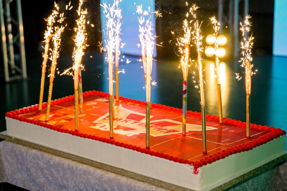 ВСЕМ ТОРТ! В завершении праздника на сцене появился огромный, величиной со стол торт, украшенный логотипом спортшколы "Виктория". Всем достался кусочек от торта, гости с удовольствием пробовали угощение.