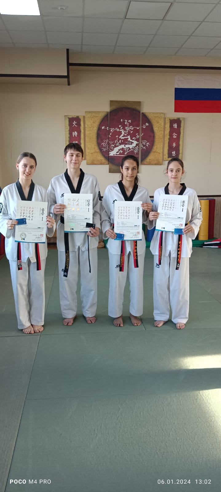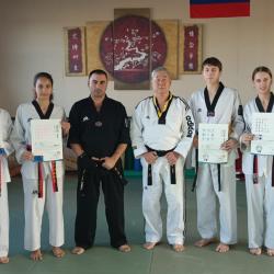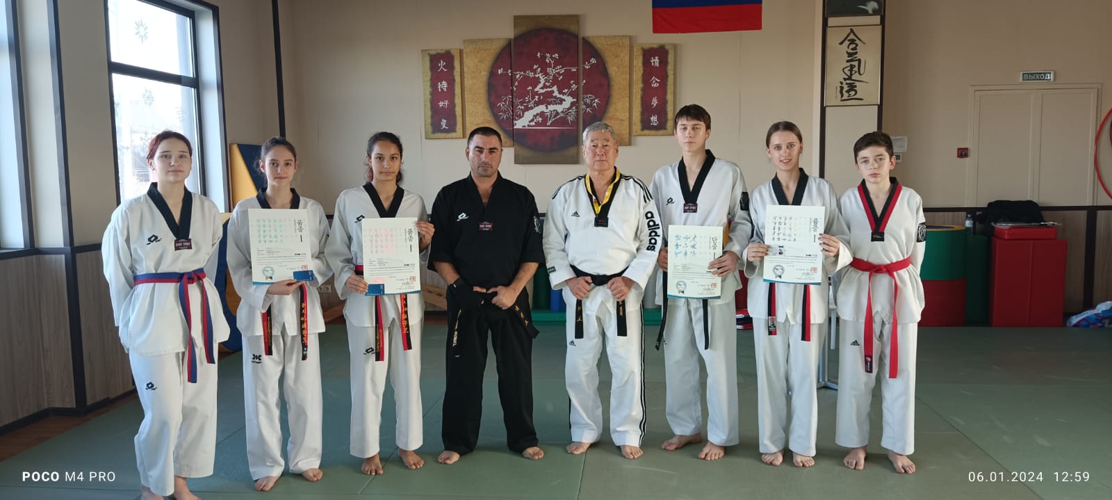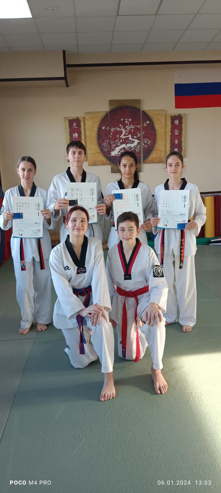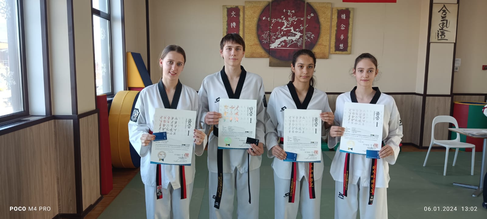 Тхэквондисты спортивной школы "Виктория" успешно выполнили все требования аттестационной комиссии. Двое ребят повысили свой технический уровень до 2 и 1 гыпа (красный и красный пояс с чëрной полосой). Ещё четверо спортсменов, аттестация у которых была летом, получили документы на чëрные пояса.