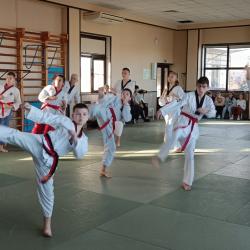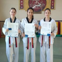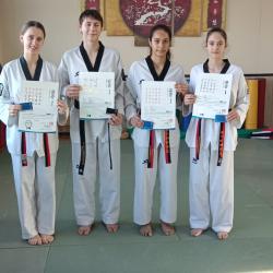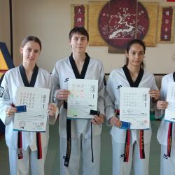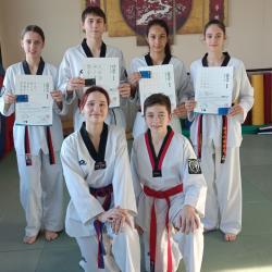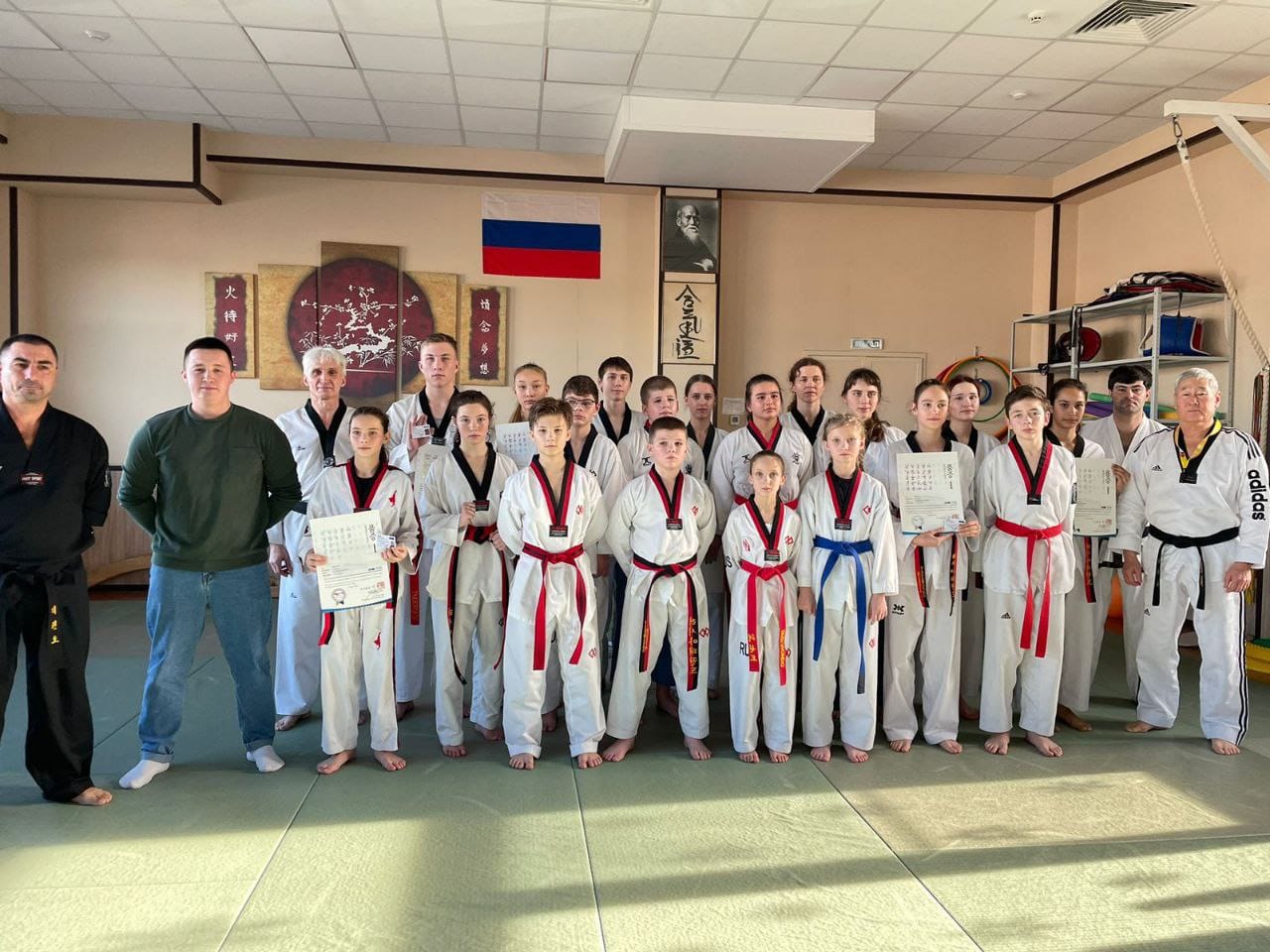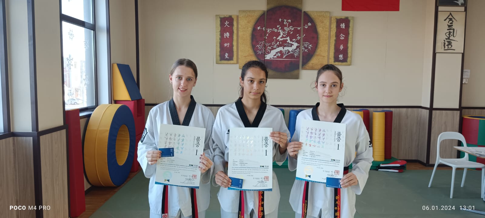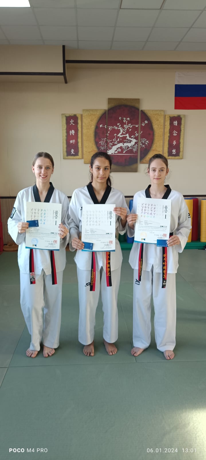 Тхэквондисты спортивной школы "Виктория" успешно выполнили все требования аттестационной комиссии. Двое ребят повысили свой технический уровень до 2 и 1 гыпа (красный и красный пояс с чëрной полосой). Ещё четверо спортсменов, аттестация у которых была летом, получили документы на чëрные пояса.