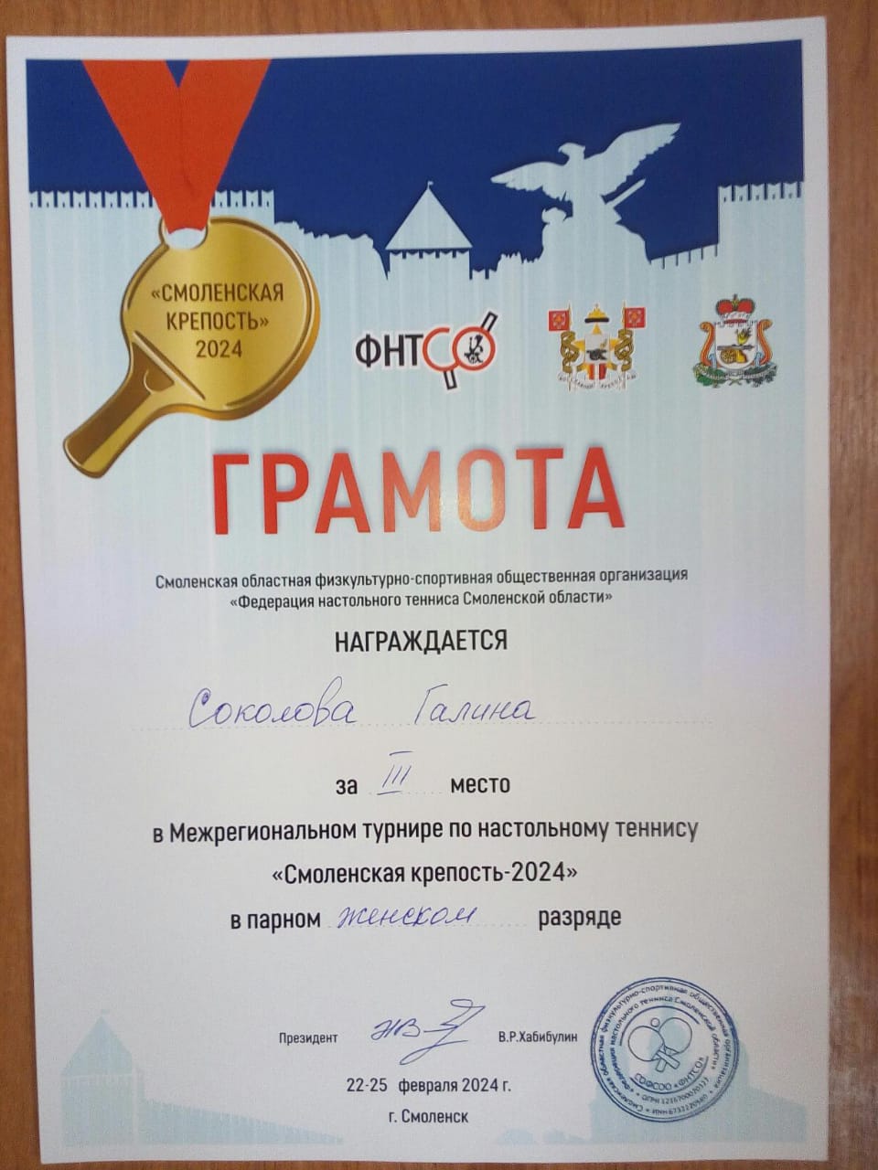22-25 февраля в Смоленске на базе спортивного оздоровительного комплекса "Смена" прошел межрегиональный турнир по настольному теннису "Смоленская крепость" среди ветеранов этого вида спорта. Больше 300 участников из 36 регионов России и Республики Беларусь боролись за победу. Участники соревновались в 14 категориях. Были разыграны 60 медалей разного достоинства.