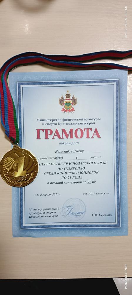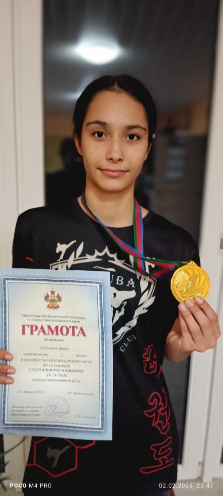 Уверенную победу в первенстве одержала главная надежда таманского тхэквондо Диана Кекелидзе. Она оказалась сильнее многих титулованных соперниц и завоевала золотую медаль соревнований и путевку в краевую сборную. Стоит отметить, что это уже второе приглашение на Первенство России 2025 года, которое заработала своими победами воспитанница тренера Георгия Кекелидзе. Кроме того, "золото" краевого первенства принесло Диане звание кандидата в мастера спорта.