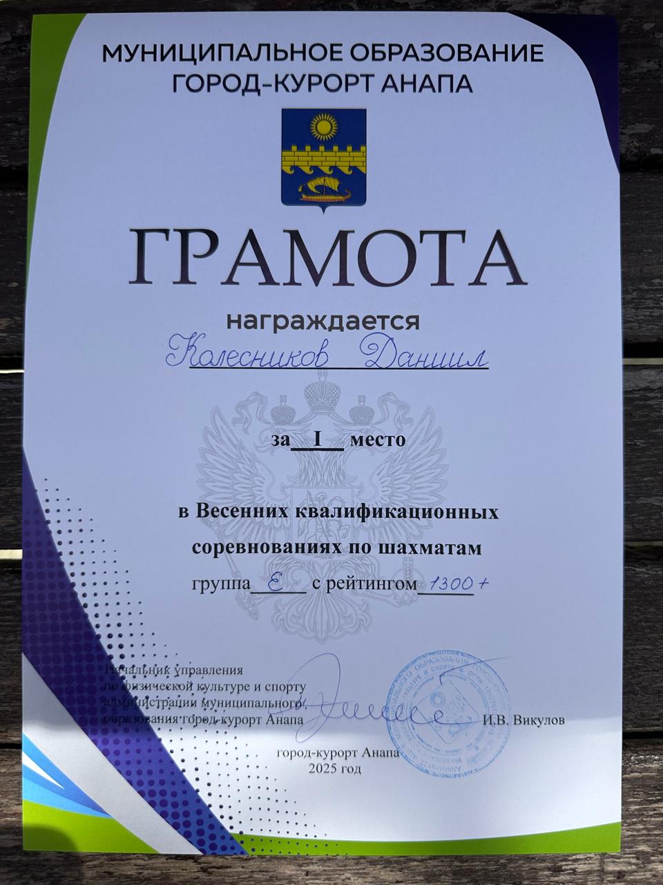 Юный темрюкский шахматист Даниил Колесников завоевал титул чемпиона среди игроков группы Е с рейтингом 1300+. В семи турах подопечный тренера Андрея Ускова выиграл четыре партии, сделал три ничьи и занял первое место.