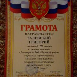 ![]() 24 апреля в Темрюке в спортивном клубе "Барс" прошел III тур открытого Чемпионата города Темрюка по настольному теннису. В соревнованиях среди сильнейших взрослых теннисистов принял участие воспитанник СШ "Виктория" Григорий Залевский наряду с тренерами Игорем Курочкиным и Галиной Соколовой. |