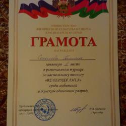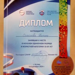 Новый год для семьи Соколовых начался со спортивных успехов. Зима посеребрила не только голову ветеранов настольного тенниса Галины и Валерия Соколовых, но и грудь. 3 января прошёл Новогодний турнир ветеранов Краснодарского края, где Валерий в возрастной группе старше 60-ти лет занял второе место, а Галина завоевала сразу две серебряные медали: среди женщин старше 40 лет и среди мужчин старше 50-ти. На этом сбор серебряных медалей семьи не закончился. |