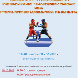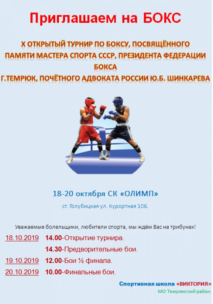 IX открытый турнир по боксу, посвящённого памяти Мастера спорта СССР, президента федерации бокса г.Темрюк, почётного адвоката России Ю.Б. Шинкарева 27-30 сентября СК «ОЛИМП» ст. Голубицкая Результаты выступления спортсменов Спортивной школы «ВИКТОРИЯ» на ежегодном турнире по боксу, в котором традиционно принимают участие спортсмены всего Краснодарского края. |